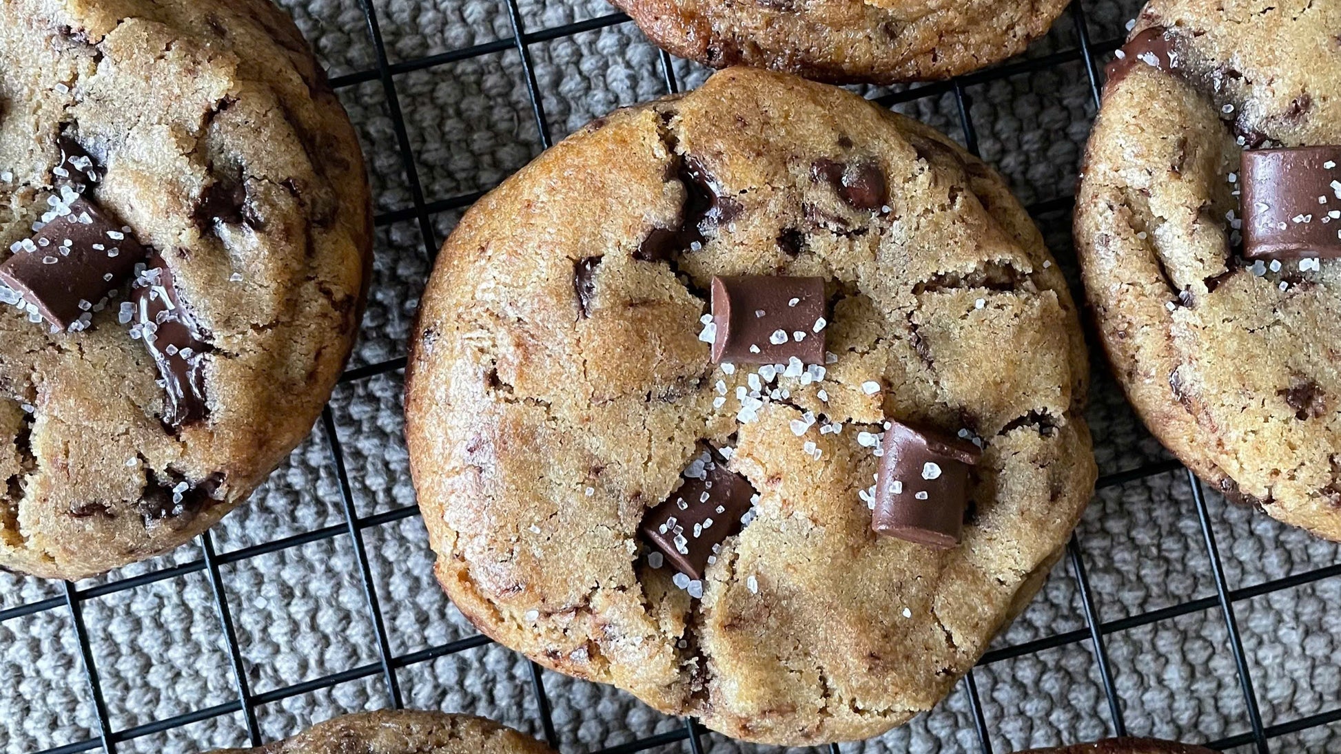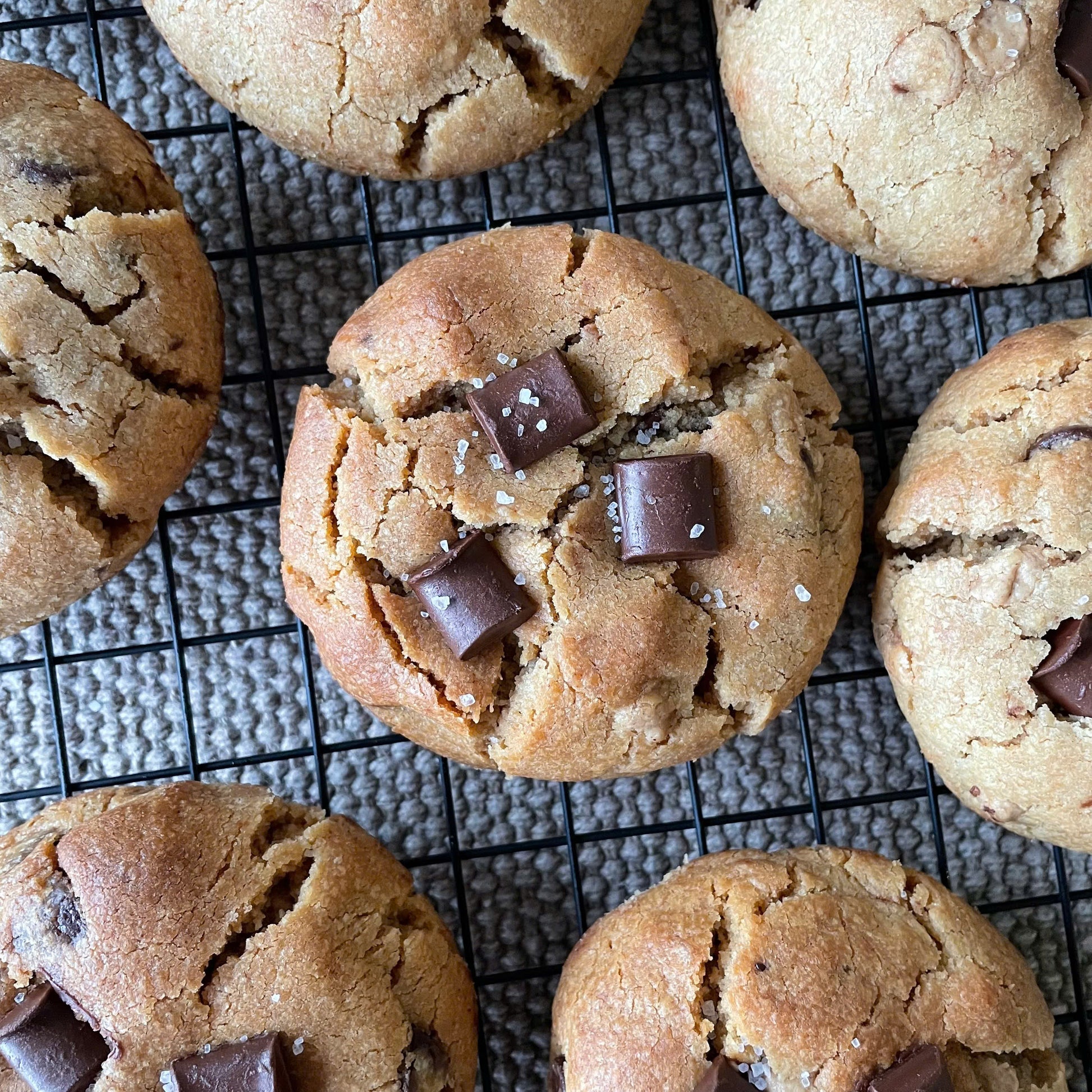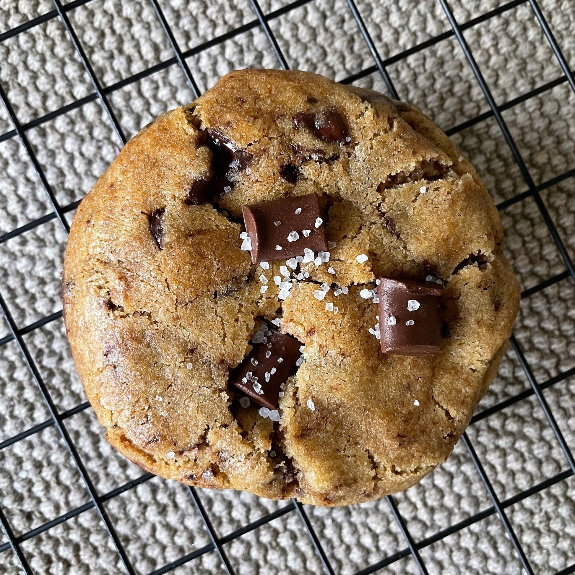 Ingredients: Chocolate chips, butter, bread flour, all-purpose flour, brown sugar, white sugar, egg, vanilla extract, salt, cornstarch, baking soda, baking powder.
