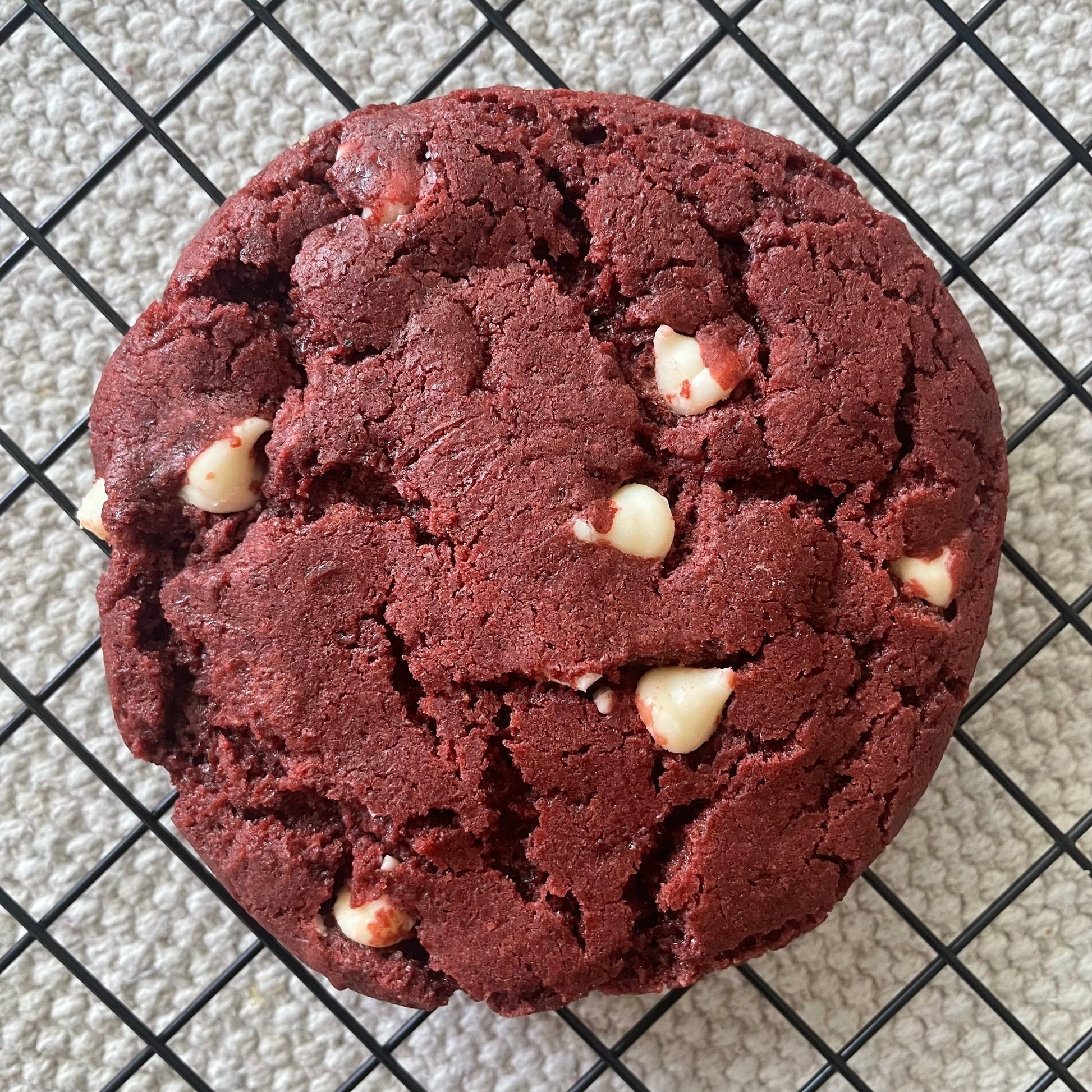 Ingredients: All purpose flour, bread flour, butter, brown sugar, granulated sugar, chocolate chips, white chocolate chips, macadamia nuts, cocoa powder, peanut butter, oats, raisins, eggs, vanilla extract, baking soda, baking powder, salt, red food coloring.