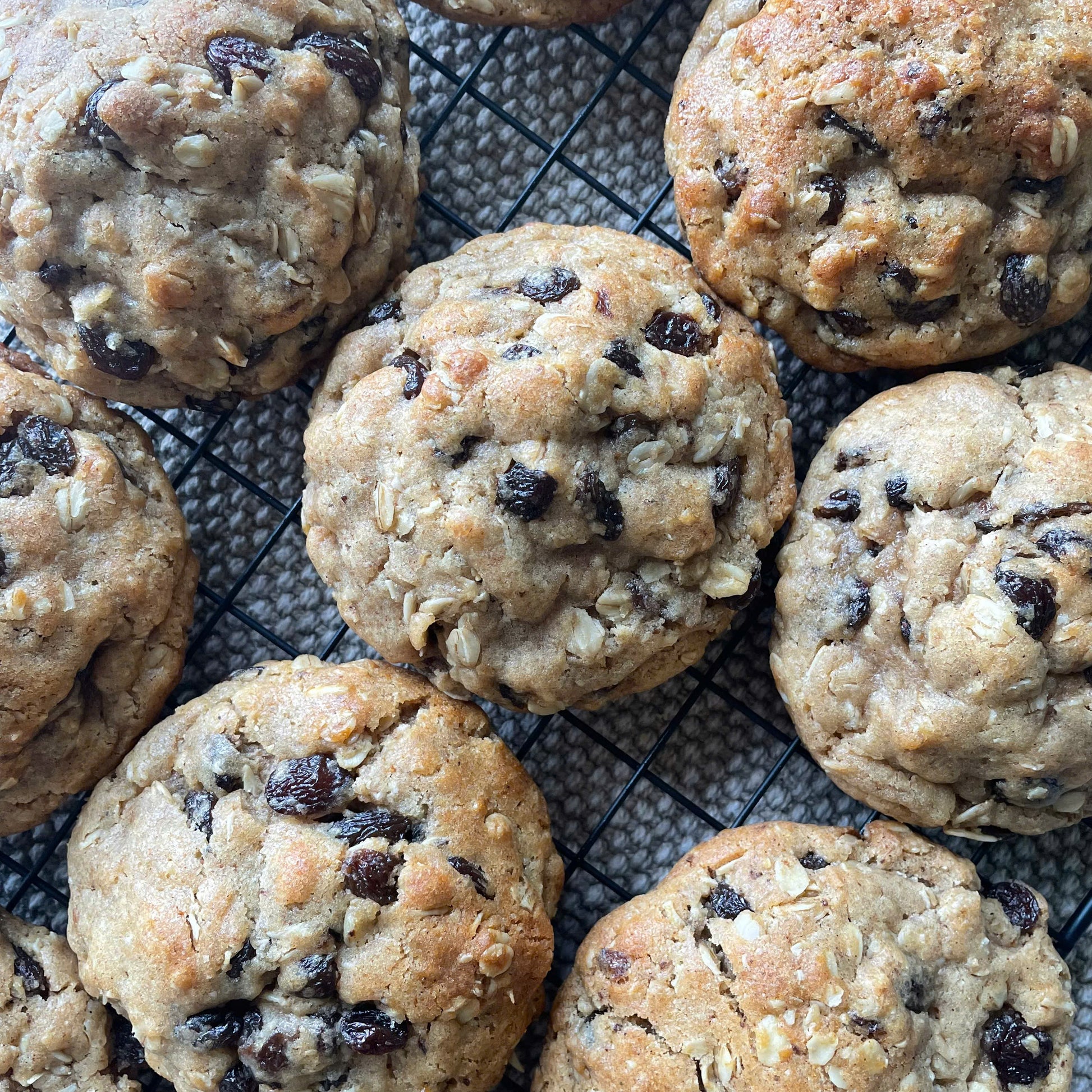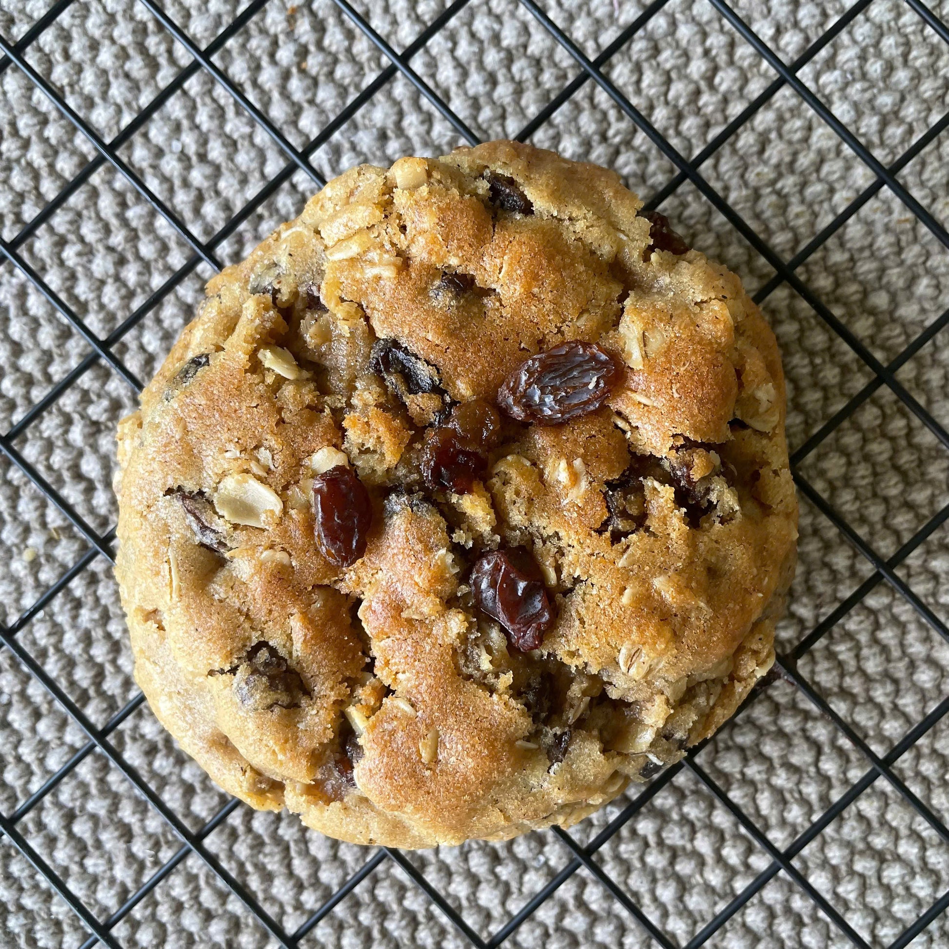 Ingredients: Butter, raisins, brown sugar, rolled oats, all-purpose flour, white sugar, eggs, bread flour, vanilla extract, cornstarch, baking soda, cinnamon, salt, baking powder, nutmeg.
